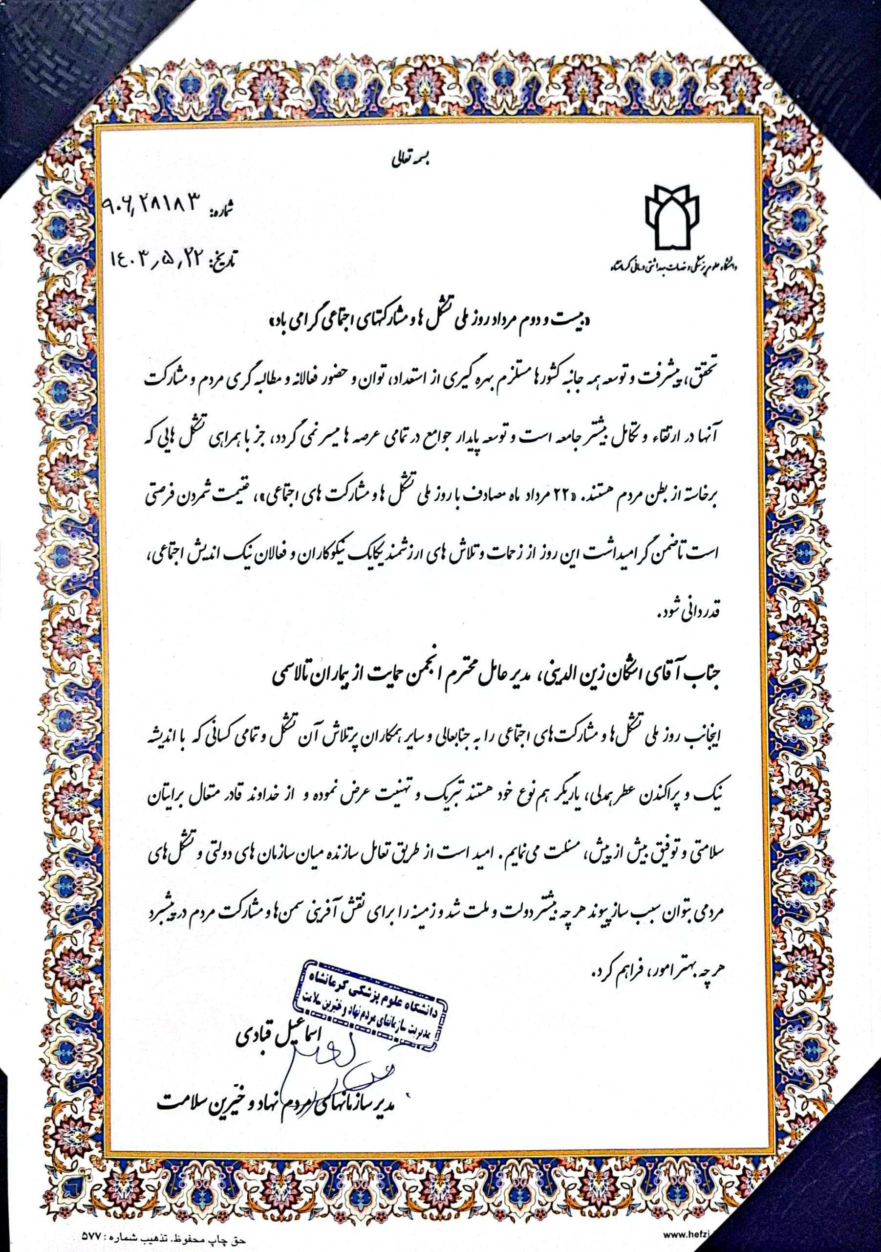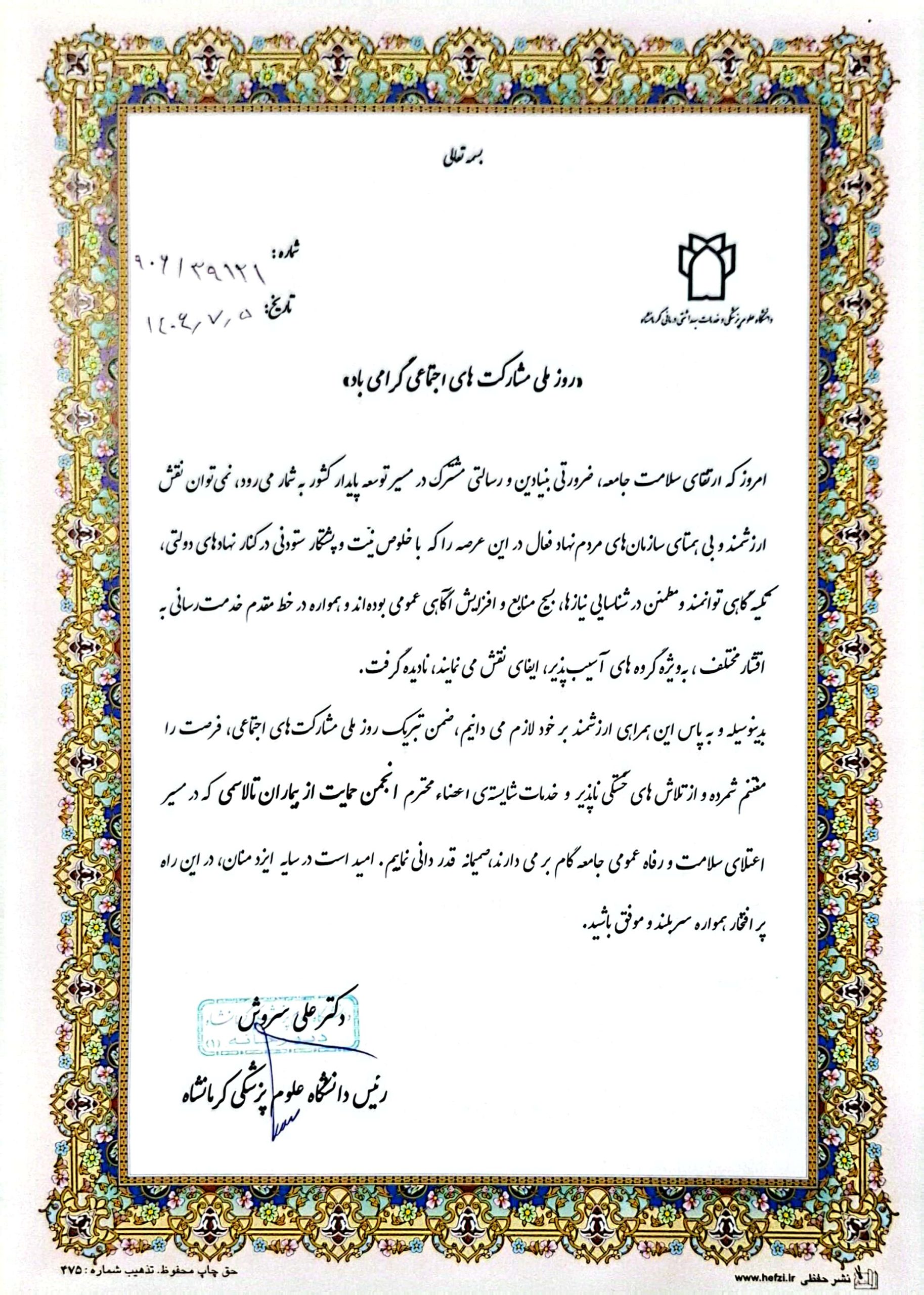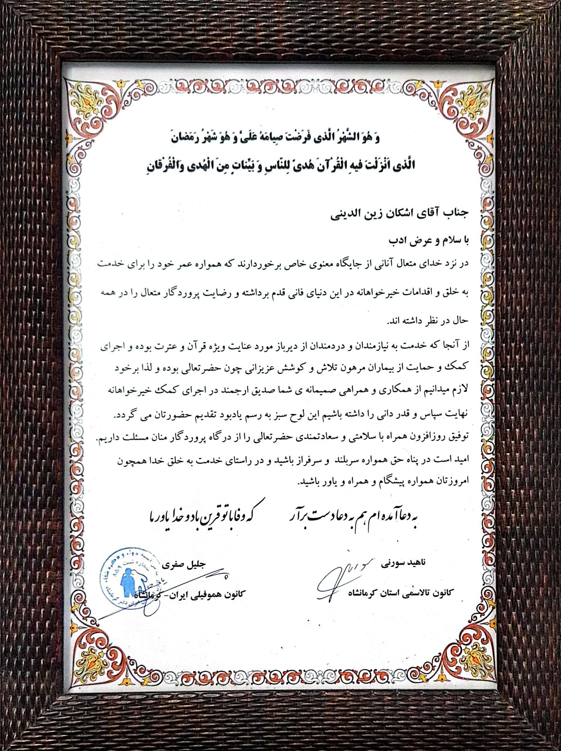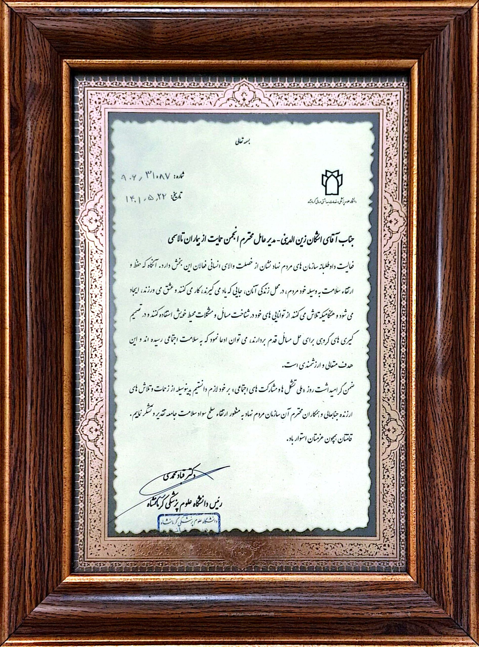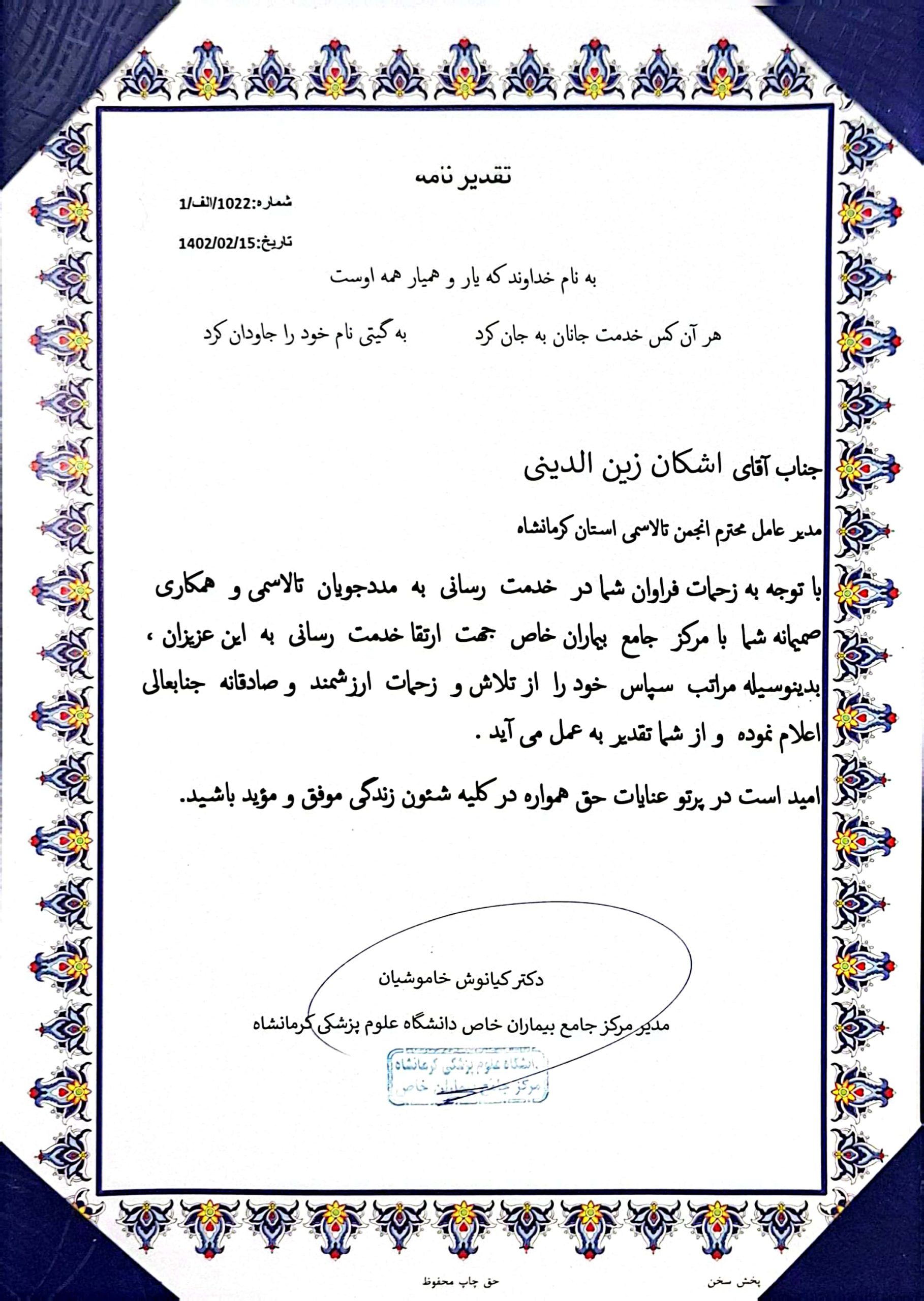 لوح تقدیر مدیر مرکز جامع بیماران خاص
