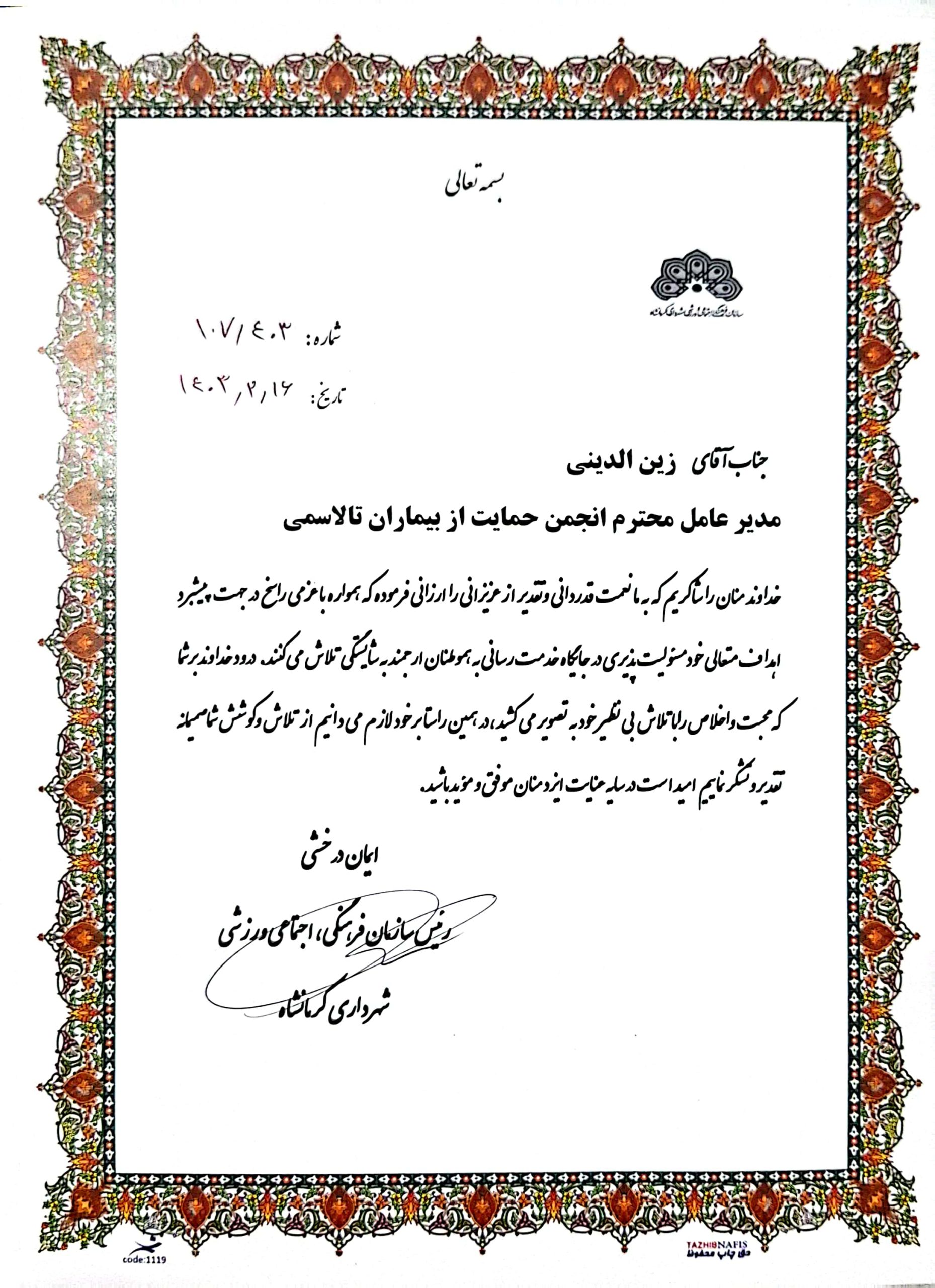 لوح تقدیر انجمن تالاسمی ایران