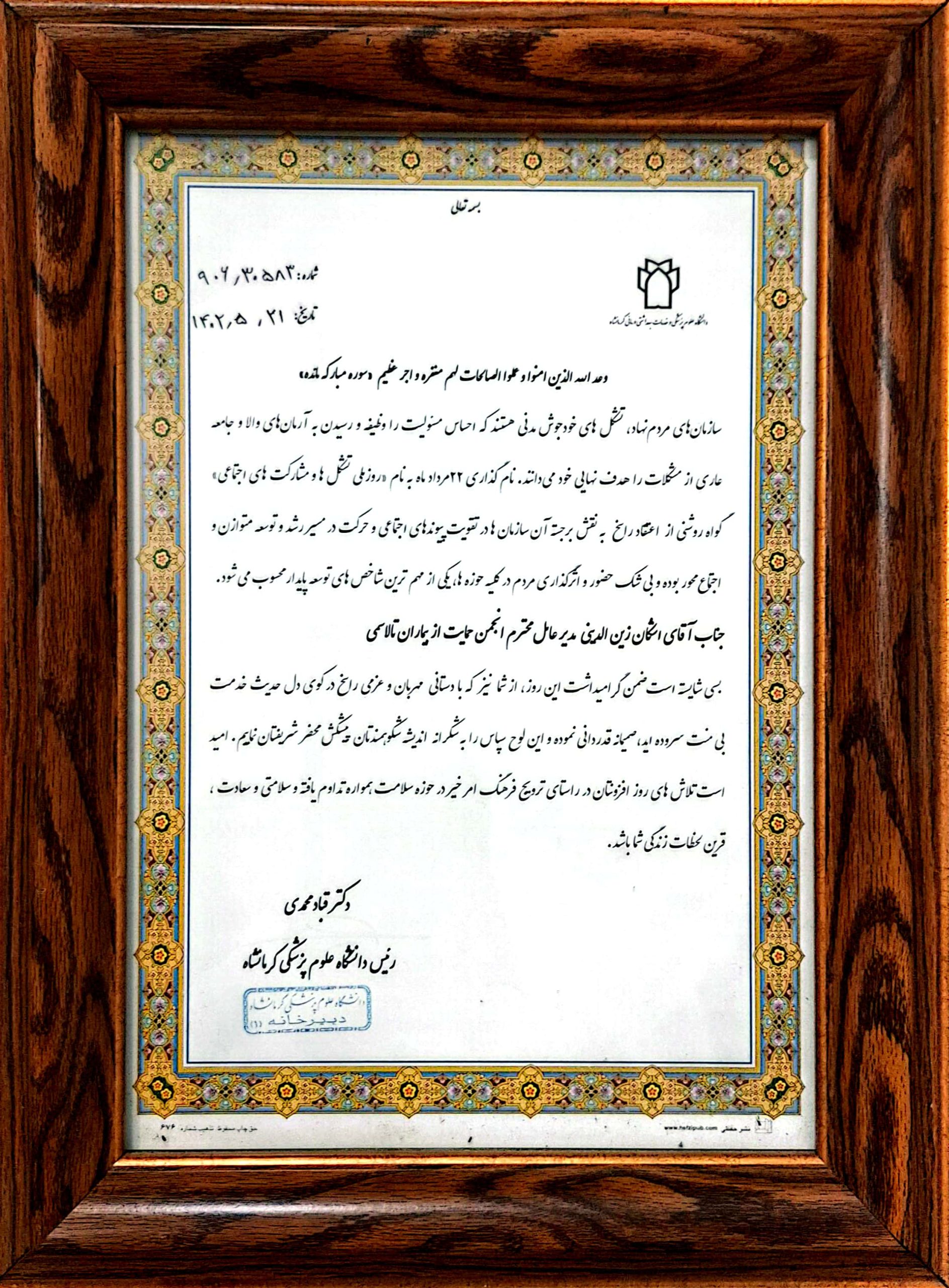 لوح تقدیر رییس دانشگاه علوم پزشکی